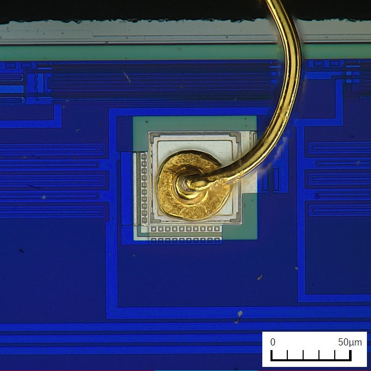 Das Bild zeigt deutlich den Golddraht, der mit dem Pad verbunden ist.