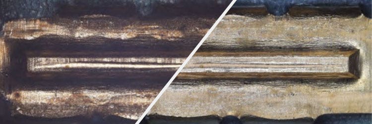 Mit einem Standard-Lichtmikroskop ist eine Delle in einem Crimpanschluss wegen der Abschattungen schwer zu erkennen (Abb. 1A). Der Grund dafür ist, dass der Lichtstrahl auf die Schräge des Crimpanschlusses trifft.