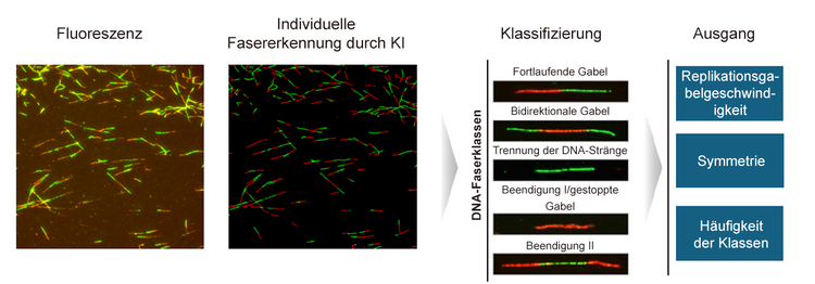 Gerade in diesem Jahr, 2025, wurde aufbauend auf den KI- und Zytometrie-Fähigkeiten von scanR ein Arbeitsablauf entwickelt, der als „Quantitative AI-based DNA fiber workflow” (Quantitativen KI-basierten DNA-Faser-Arbeitsablauf) bezeichnet wurde. Bei diesem Verfahren wurde der Replikationsstress anhand der einzelnen DNA-Fasern, die unter dem Mikroskop abgebildet wurden, in automatisierter Weise untersucht.2 Die DNA-Faseranalyse gab es bereits, aber ausschließlich mit manueller Bildaufnahme und -analyse, was sie zeitaufwändig und anfällig für Benutzerfehler machte. Der neue KI-basierte DNA-Faser-Workflow (qAID) ermöglicht die Bildgebung und Multiparameteranalyse von Tausenden von DNA-Fasern innerhalb von weniger als einer Stunde.