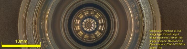 Das DSX 1000 Mikroskop kann hochauflösende Bilder mit einem Vergrößerungsbereich von 23x bis 8220x aufnehmen und ermöglicht Beobachtungen im Makro-Bereich mit geringer Vergrößerung sowie Beobachtungen mit hoher Vergrößerung im Mikro-Bereich, wie z. B. die obige Abbildung des Aufdrucks der Babyflasche.