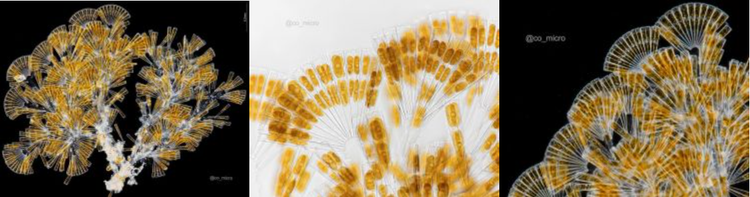 Wir sind große Fans dieser atemberaubenden Kieselalgen aus der Sagami Bucht in Japan! Kieselalgen der Gattung Licmorphora kommen an Meeresküsten vor und wachsen häufig sogar auf künstlichen Oberflächen. Sie zählen zu den Epiphyten, d. h. zu den Organismen, die ihre Feuchtigkeit und Nährstoffe aus der Luft, dem Regen, dem Wasser oder aus den Ablagerungen um sie herum gewinnen. Diese Licmophora Kieselalgen sehen aus wie wunderschöne japanische Faltfächer!