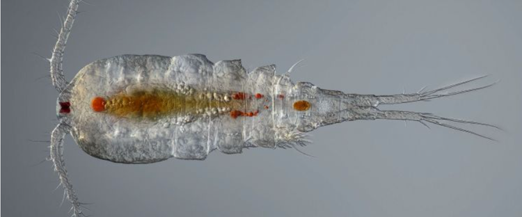 Dieser atemberaubende durchsichtige Schwimmer ist ein weiblicher Ruderfußkrebs aus einem kleinen Teich. Copepoden (Ruderfußkrebse) sind eine Gruppe kleiner Krebstiere, die beinah in allen Süß- und Salzwasserlebensräumen zu finden sind. Das hier abgebildete Exemplar stammt aus der Wüste von Al Qudra in Dubai. Die Probe wurde bei 100-facher Vergrößerung mit Fokus-Stacking von 76 Einzelaufnahmen abgebildet, um eine maximale Auflösung zu erreichen.
