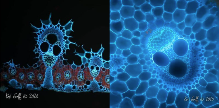 Diese mikroskopisch kleinen, skelettartigen Figuren sehen aus, als stammen sie aus einem Albtraum (oder als würden sie ein lustiges Halloween-Kostüm abgeben), aber sie sind völlig harmlos – und, obwohl sie lebendig sind, leblos! Diese Bilder zeigen eine UV-induzierte Fluoreszenz eines 20-Mikrometer-Abschnitts des Rohrkolbens einer Teichbinse, einer grasartigen Pflanze, die in Sümpfen, Teichen und auf Feuchtwiesen wächst.