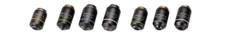 Spezielle LEXT Objektive von links nach rechts: 10X Objektiv mit geringer Vergrößerung, 20X, 50X und 100X Hochleistungsobjektive und 20X, 50X und 100X Objektive mit großem Arbeitsabstand.