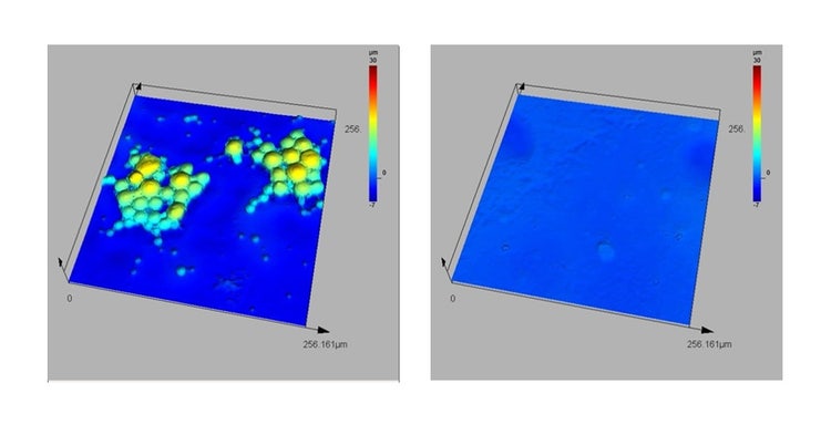 Nach der Erfassung der Daten in 3D ist erkennbar, dass der stark wasserabweisende Joghurtdeckel kugelförmige, konvexe Aggregate unterschiedlicher Größe aufweist, die zufällig auf der Grundfläche verstreut sind. Im Gegensatz dazu hat der Deckel mit geringer Wasserabweisung keine auffällige konvexe Form.