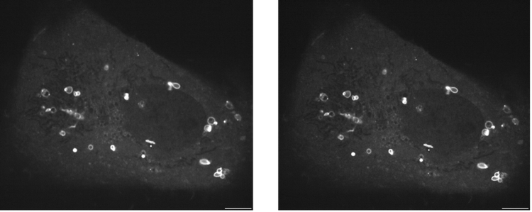 Abbildung 9: Live-Imaging mit Super-Resolution von LC3-EGFP-exprimierenden U2OS-Zellen . Durch die TruSight SR-Verarbeitung lässt sich ein qualitativ hochwertiges Bild mit Superauflösung erzielen, selbst wenn das SNR des Ausgangsbildes niedrig ist. Links: Ausgangsbild mit niedrigem Signal-Rausch-Verhältnis, aufgenommen mit dem IXplore IX85 SpinSR (SoRa Disk, Projektionsobjektiv: 2,8X) und einem UPLXAPO100XO-Objektiv (NA 1,45). Rechts: Das linke Bild basiert auf TruSight SR 2D-Verarbeitung (Filterstärke 1,5). Maßstabsbalken: 5 µm.