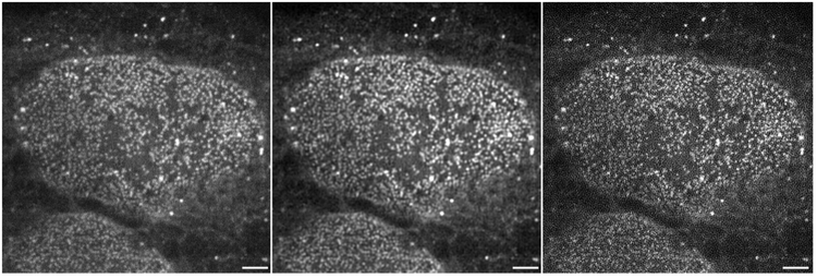 Bei der Bildgebung lebender Zellen ist es notwendig, die Auswirkungen auf lebende Zellen durch die Verwendung einer möglichst schwachen Lichtanregung zu minimieren. Daher ist es schwierig, Fluoreszenzbilder mit hohem SNR zu erhalten. TruSight SR liefert Live-Bilder mit superhoher Auflösung und verbessertem SNR, indem es für Bilder mit schwachen Fluoreszenzsignalen eine zuverlässige, auf linearer Dekonvolution basierende Verarbeitung mit geeigneten Filterstärken durchführt.