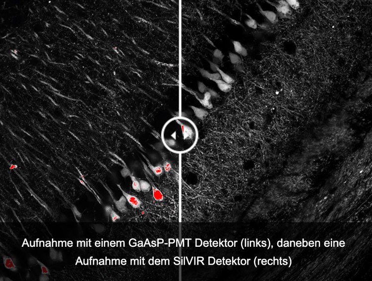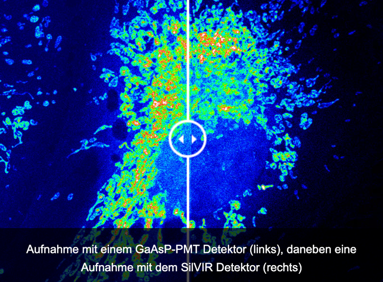 Die Photonendetektionseffizienz des Detektors ist bei allen Wellenlängen höher als die der GaAsP-PMT Detektoren, die sonst für die hochempfindliche konfokale Bildgebung verwendet werden. Dadurch zeichnet sich der SilVIR Detektor durch ein hervorragendes Signal-Rausch-Verhältnis (S/N) aus, sodass selbst schwache Fluoreszenzsignale sichtbar werden.