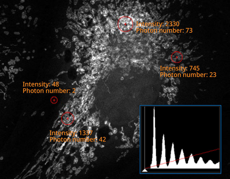 Die Technologie unseres SilVIR Detektors sorgt für eine präzise Quantifizierung der Bildintensität für zuverlässigere Daten. Anschließend werden die Bilddaten als Anzahl von Photonen ausgegeben, die den absoluten Wert der Fluoreszenzintensität für jedes Bild angeben. Der größere dynamische Bereich ermöglicht eine genaue Quantifizierung der Fluoreszenzintensität anhand der Photonenzahl selbst bei hoher Intensität.