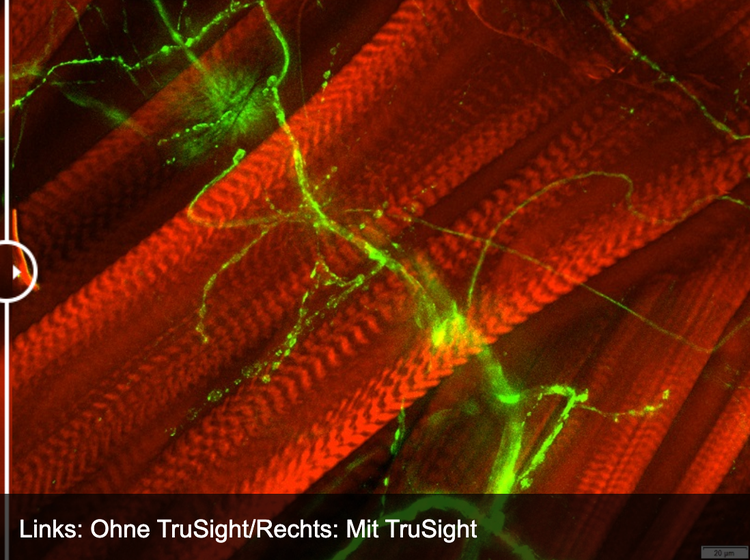 Mit unserer cellSens Dimension-Software können Sie Live-2D-Deburring für die Vorschau und Erfassung nutzen und selbst dickste Proben außergewöhnlich gut fokussieren. Es ist auch eine erweiterte TruSight-Dekonvulation mit einem iterativen Algorithmus verfügbar, um Auflösung, Kontrast und Dynamikbereich zu verbessern. Um die Effizienz von Experimenten noch weiter zu erhöhen, können Sie die Dekonvolution als Makrofunktion im Graphical Experimental Manager (GEM) definieren.