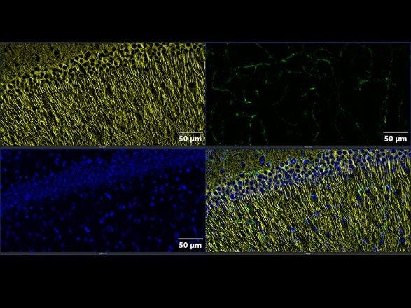 VS-SILA Bild eines 40 µm Sagittalschnitts des Mäusegehirns. Das Bild wurde bei 4-facher Vergrößerung aufgenommen, der detaillierte Scan ist ein Extended Focal Image (EFI) einer 19 µm Z-Serie, aufgenommen bei 20-facher Vergrößerung. Blau: DAPI, Grün: GFAP (Astrozyten), Gelb: IbaI (Mikroglia). Rot: NeuN (Neuronen). Bildquelle: Institut für Experimentelle Neuroregeneration, Zentrum für Querschnitt- und Geweberegeneration Salzburg (SCI-TReCS), Paracelsus Medizinische Universität, Österreich.