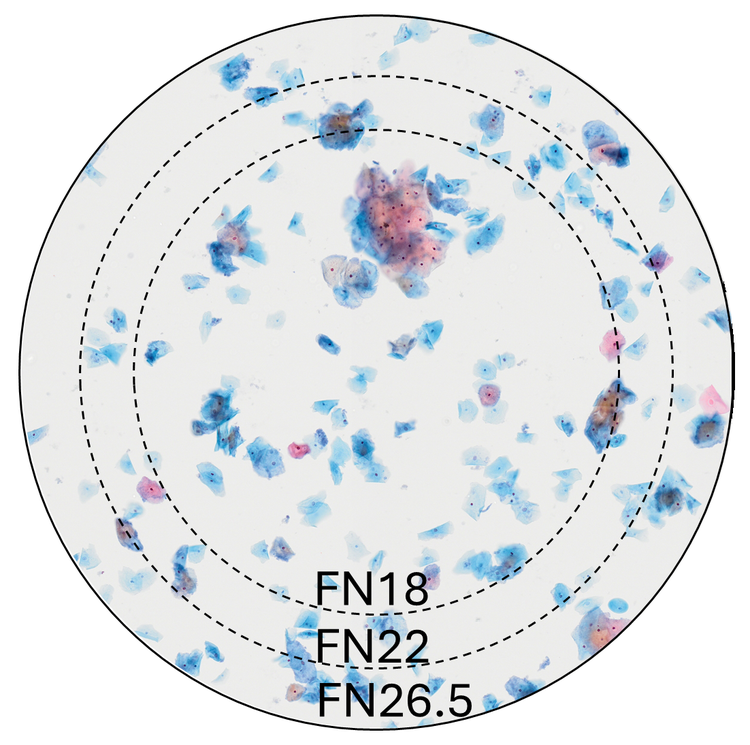 Using a larger FN offers practical advantages. With FN26.5, only 7 HPFs are needed to examine the same area as 10 HPFs with FN22. If the result is already diagnostically significant at this point, stop counting. If the result is borderline, continue to 10 HPFs and apply the interpolating correction factor. Since you will have evaluated 31% more slide area than with FN22, you have a statistical advantage when confirming your diagnosis.