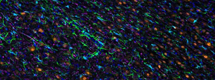 Rat brain stained with Hoechst 405, CPCA-GFAP 488, FOX3/NeuN 594, RPCA-Iba1 647, and NF-H conjugate 750.