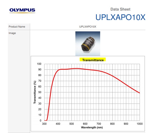 The transmittance info shows you if the objective can be used in the ultraviolet (UV), visible, near-infrared (NIR), or infrared (IR) range.