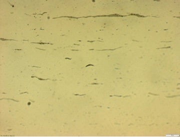 An image of cross-sectioned polished metal under brightfield observation with no DIC (above) and with DIC (below).