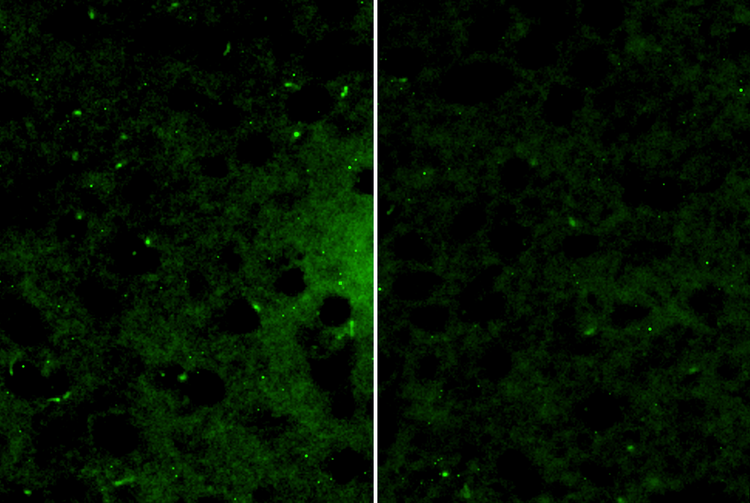 Figure 1. Comparative images of primary cilia in the brains of control mice and mice subjected to 21 days of stress. Marked shortening of the primary cilia and a significant decrease in ciliated cells were observed in the stress group (Figure 1b, right image). Green indicates neuronal primary cilia stained with the cilia marker (AC3).