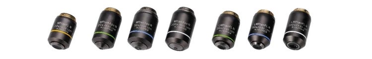 Dedicated LEXT objectives from left to right: 10X low magnification objective, 20X, 50X, and 100X high-performance objectives, and 20X, 50X, and 100X long working distance objectives.