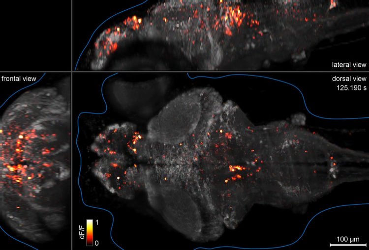 Specimen: Neural activity in an entire zebrafish brain in vivo. The video, which shows fast 3D recordings of the entire larval brain (ca. 100,000 neurons), depicts, for the first time, an almost exhaustive view of single-neuron activity in the brain of a living vertebrate