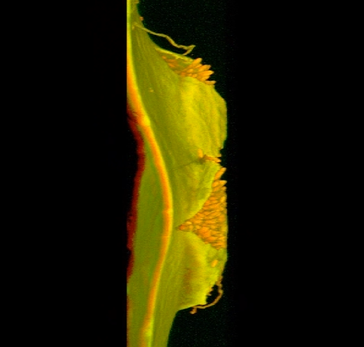Specimen: Fungus rupturing surface of blueberry, 32 composite images, each made by combining 90 optical sections