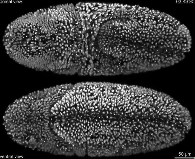 Specimen: Multiple views of Drosophila embryonic development. This embryo was recorded in 30-second intervals over a period of 24 hours, starting three hours after egg laying. The video may help reveal cell lineages, cell differentiation and whole-embryo morphogenesis, essential aspects of developmental biology. The newly hatched larva begins to crawl off screen at the end of the video.