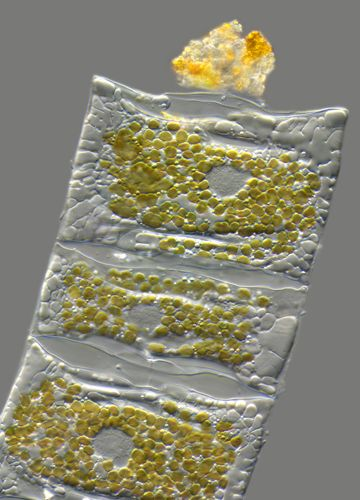 Specimen: Living diatom Mediopyxis helysia, showing the cell nuclei and golden chloroplasts.