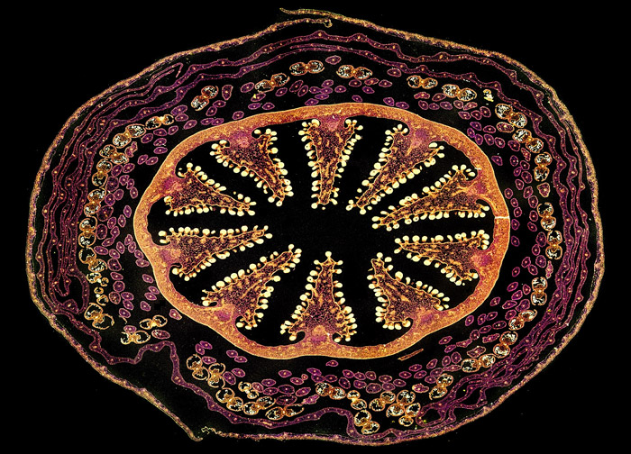 Specimen: Single-cell fresh water algae (desmids). Composite image including, concentric from the outside: Micrasterias rotata, Micrasterias sp., M. furcata, M. americana, 2x M. truncata, Euastrum sp. and Cosmarium sp.
