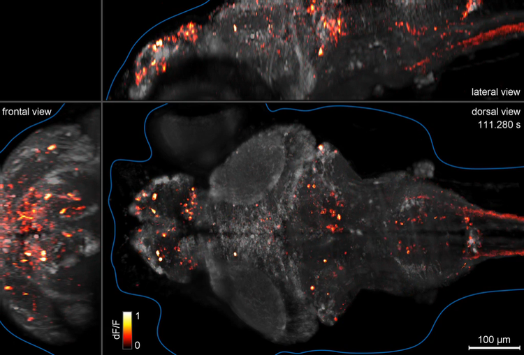 Specimen: Neural activity in an entire zebrafish brain in vivo. The video, which shows fast 3D recordings of the entire larval brain (ca. 100,000 neurons), depicts, for the first time, an almost exhaustive view of single-neuron activity in the brain of a living vertebrate