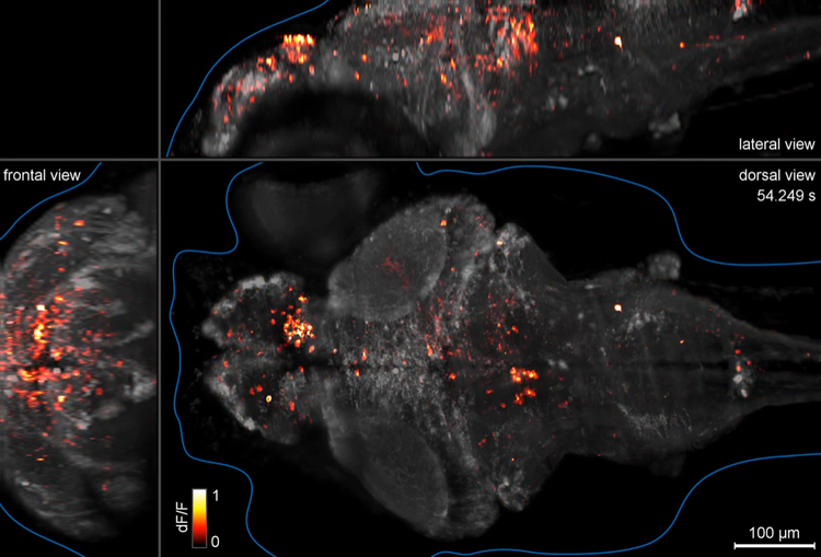 Specimen: Neural activity in an entire zebrafish brain in vivo. The video, which shows fast 3D recordings of the entire larval brain (ca. 100,000 neurons), depicts, for the first time, an almost exhaustive view of single-neuron activity in the brain of a living vertebrate