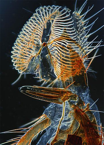 Specimen: Claw of crustacean amphipode Phronima sp. Muscles and rows of pigment cells (melanocytes) are visible.
