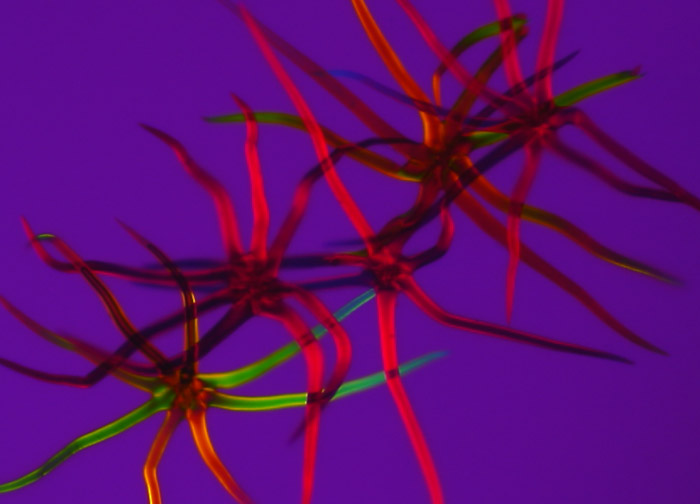 Specimen: Phantom midge larva (Chaoborus) "Glassworm." Birefringent musculature that is usually clear and colorless is made visible here by specialized illumination.