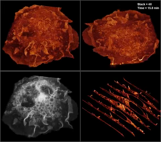 Specimen: Mouse embryonic fibroblasts showing actin filaments (red), mitochondria (green) and DNA (blue).