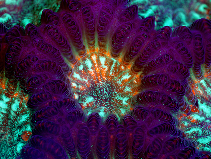 Specimen: Live coral Goniastrea sp., known as green brain coral. One full polyp in the center is shown with four surrounding polyps. Walled corallites are purple.