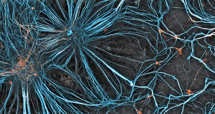 Specimen: Mouse embryonic fibroblasts showing actin filaments (red), mitochondria (green) and DNA (blue).