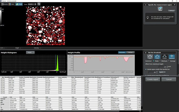 - Can acquire height data in a plane for a wide range of measurements and observations, such as pore diameter and area ratio by particle analysis, pore depth measurement by profiles, and 3D display.