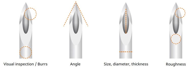 - The length, outer diameter, needle tip angle, etc. are stipulated in the standard, and highly reliable measurement is required.