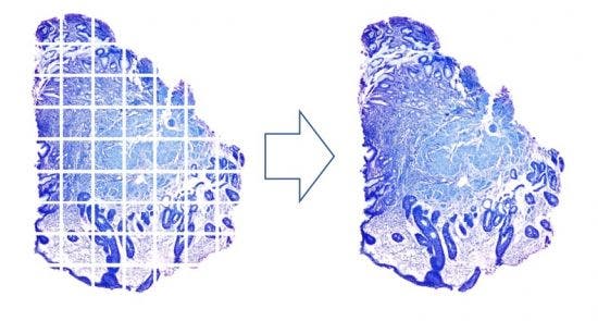 Seamless wide-area images of whole tissue sections are generated from multiple images acquired in high magnification and corrected for small mismatches, enabling you to visualize the entire tissue section. Focus view makes it easy to correct for differences in tissue thickness as the image is acquired, eliminating the need for time-intensive Z-stacks.
