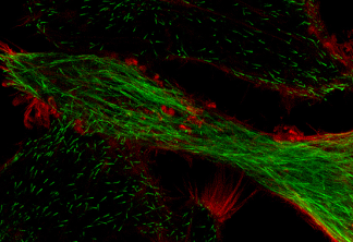 Cultured HeLa cells expressing Lifeact-mScarlet-I and EB3-3xmNeonGreen. Sample courtesy of: Haruka Mii, Prof. Kazuhiro Aoki,Graduate School of Biostudies, Kyoto University.