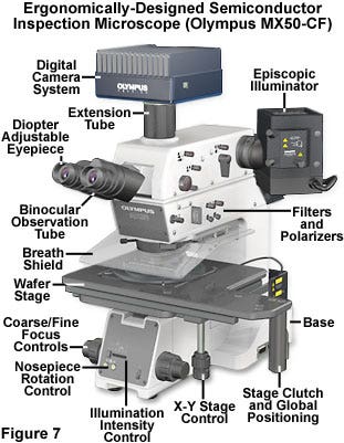 Industrial reflected light widefield and confocal microscopes are becoming increasingly popular as process monitoring and quality control tools in the booming semiconductor industry. Operators attending workstation monitors in wafer assembly plants often spend up to eight hours a day examining integrated circuits for defects, improper mask alignment, and process errors. Paramount in the development of these microscopes is an advanced optical system providing superior illumination, greater depth of focus, highly corrected objectives, and contrast enhancing light conditioners. The instruments are often equipped with specialized stages designed specifically for rapid manipulation of wafers having varying dimensions (Figure 7). To increase stability, semiconductor inspection microscopes are built with rigid and sturdy bases having sufficient weight to resist blur and image shifts induced by floor vibrations.