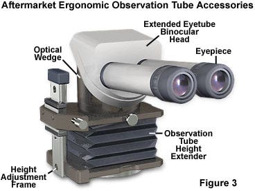 Some companies now produce adapters that allow conventional microscopes to be modified to better fit individual users (Figures 1 through 4). Body tube extensions can increase the distance between the eyepieces and stage controls, and optical wedges can provide a greater angular range of adjustability, between 30 and 80 degrees. Aftermarket microscope stands allow an instrument to be elevated and rotated for increased comfort.