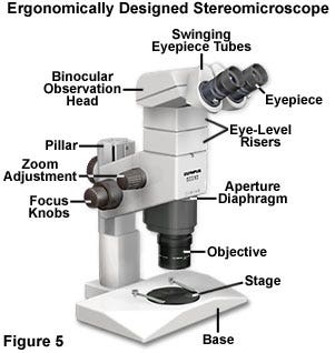 Presented in Figure 5 is an illustration of a late model state-of-the-art stereo microscope designed by Olympus, the SZX. This instrument features lowered focus knobs, an eye-level riser intermediate piece, and ergonomic tilting eyepiece tubes to increase user comfort and reduce the amount of fatigue and stress associated with operation of the microscope. Also available for this microscope are a number of accessories including an ergonomic 1x objective, which allows the operator to control eye-level position, and extended eyepiece tubes that further modify the viewing angle. The eyepieces have an adjustable diopter range and are made with high eyepoint to ease the burden of wearing glasses while observing specimens in the microscope.