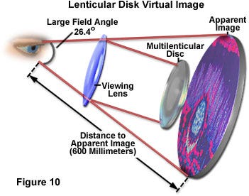 Lenticular array technology is based on a rotating optical disk that contains several million tiny individual microlenses (termed lenticules) that act in concert to expand the depth of focus and field of view when the disk is spun at high rotational speeds (Figure 10). The transparent disks are about 15 millimeters in diameter and are utilized in either a transmitted or reflected mode to enhance observation. Each of the individual lenticules is about 70 micrometers in size, but they are merged to deliver a smooth image when the disk is spun at speeds up to 3,500 revolutions per minute.