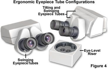 Eyepiece tube angles are almost infinitely adjustable on some of the latest microscope designs (Figures 2 and 4). In addition to a tilt range between 25 and 40 degrees, some binocular tubes have a telescoping adjustment that enables the eyepieces to be moved backward and forward over a span of 30-50 millimeters to accommodate the operator. Microscopes can be fitted with eye-level riser blocks to increase the height of eyepiece tubes and some have eyepoint adjusters, which employ swivel joints to increase or decrease the height of the eyepoint position relative to the desktop (Figure 4). The result is that almost every microscopist, regardless of size and height, can peer straight into the eyepieces without tilting the head, a considerable improvement in design that ensures a comfortable working position. Even when the posture inevitably changes after several hours of observation, the eyepoint can be adjusted to match the new position and reduce fatigue. Easy diopter and interpupillary distance adjustments in modern eyepieces also serve to reduce operator discomfort, and reduced diameter eyepiece lenses in some models aid observation by operators with deep eye sockets.