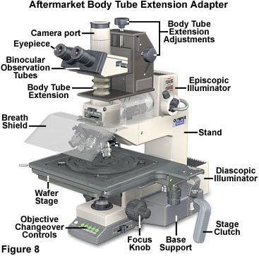 Several standards have been adopted by the semiconductor industry (SEMI S2-93A and S8-95) to provide safety and ergonomic features for microscopes designed to be operated in wafer fabrication plants. Among the requirements for these instruments are controls and knobs that are positioned low and close to the operator while the eyepoint is set at the proper height for comfortable operation. The manufacturers have designed microscopes that have focus, illumination, and objective controls positioned in the base, beneath the stage and directly in front of the operator or in a separate keypad that can be conveniently located. These features minimize hand movement and enable "blind" operation, which reduces the distraction of a search for adjustment knobs or manual rotation of the objectives. In addition, most models have eyepieces moved to a forward position on the microscope where they are located closer to the operator, allowing a more erect seated posture. The latest microscopes are equipped with tilting eyepiece tubes that provide continuous adjustment of the tilt angle through a range of zero (horizontal) to 45 degrees for viewing at the optimum eyepoint level. Some models also have telescoping tubes that enable the operator to shift the viewing position closer to or farther away from the microscope body and some even incorporate image-erecting prisms. These features are important in situations where operators must inspect wafers in a standing position, and are thus subject to a more rapid onset of fatigue.