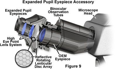 Increasing the field of view and the distance from the observer's eyes to the microscope has been the target of a growing number of aftermarket products. Utilizing lenticular array technology, Vision Engineering has introduced a new ergonomic accessory termed Isis, which can be retrofitted to existing microscopes by insertion into standard observation tubes (Figure 9). This product increases the effective distance of the eyes to about 38-40 millimeters from the eyepieces, expanding the pupil image and providing the operator greater freedom of head movement with better posture. The manufacturer also claims that Isis reduces the distraction of eye floaters, which move across the field of vision and are accentuated by viewing specimens in bright illumination.