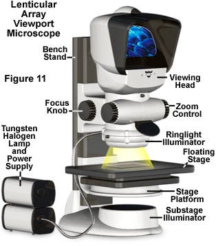 More advanced applications of lenticular array technology are manifested in microscope designs that employ viewing heads in place of eyepieces (Figure 11). First applied to stereo microscopes, this approach substitutes a lenticular array-driven screen that is positioned on top of the microscope body to allow the operator wide latitude in viewing angle and distance. Operators who wear eyeglasses can easily view specimens for long periods of time without the discomfort associated with repeated re-focusing when the glasses are removed. These microscopes are also designed with ergonomic standards in mind, and have focusing, zoom, and illumination adjustments that are positioned low on the base for easier operation.