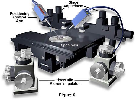 Micromanipulators - It is often necessary to manipulate the specimen while it is being observed under the microscope. This is the case in many tissue culture and in vitro fertilization experiments as well as genetic implantation procedures that require close observation of the sample during the experiment. The micromanipulator stage illustrated in Figure 6 is an example of the type of equipment necessary to conduct these types of operations.