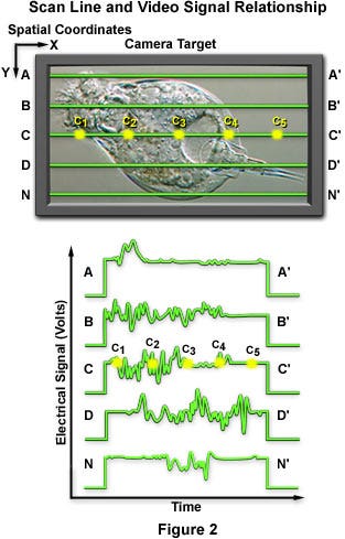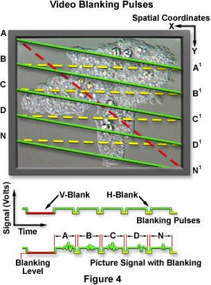 The conversion of a two-dimensional image captured through a microscope into a recoverable train of electrical impulses is accomplished by sequentially scanning narrow strips of the optical image. In principle, the microscope image can be scanned by any electro-optical detector that is capable of rapidly converting light intensity into an electrical voltage or current. Many of the characteristics of video signals can be understood by display of the scanned electrical signal on a suitable oscilloscope.