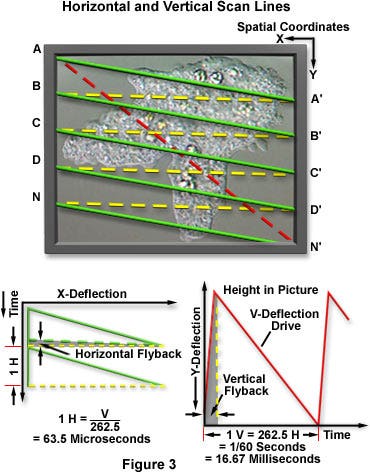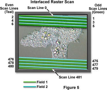 In conclusion, we have reviewed the production of a linear series of electrical signals generated during a raster scan of a "live" image. The signals include the camera blanking pulses and the illumination intensity (brightness) at each point in the original image. By interlacing the scans, refresh frequencies that exceed the critical flicker point are readily obtained to produce video images that are pleasing to the eye.