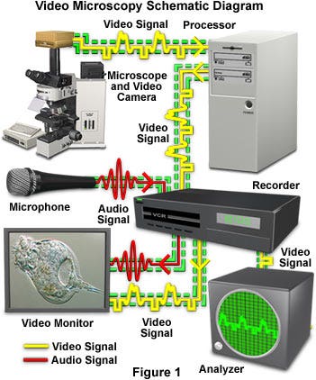 The primary function of video is to produce an electrical signal by scanning an optical image of a dynamic scene, then transmitting a faithful reproduction of the information in real time to a receiver housed in a remote location for viewing or recording of the original event. Important features and components of video microscopy are diagrammed in Figure 1. An optical event is first captured in the microscope and translated into an electrical video signal by an electronic camera attached to the trinocular tube. The signal may be either processed or recorded, then sent to an analyzer or converted back into a two-dimensional image on a video monitor (Figure 1) in real time. Addition of an audio signal to the video information (by recording sound on a VCR or similar device) allows concurrent annotation of comments that often captures otherwise irretrievable information.