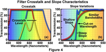 The slope of a filter transmission band is utilized to define the steepness of the transition between the wavelengths passed and those blocked by the filter. This profile is especially important in edge filters, which rely on very sharp slopes to define the narrow wavelength boundary regions that separate transmitted wavelengths from those blocked by the filter. As an example, the spectra in Figure 4(b) illustrate two edge filters having significantly differing slopes with associated boundary regions of unequal size, but with similar passbands. In the absence of spectral diagrams, the slope of a filter can be described by identifying the wavelength at a specified blocking or attenuation level.